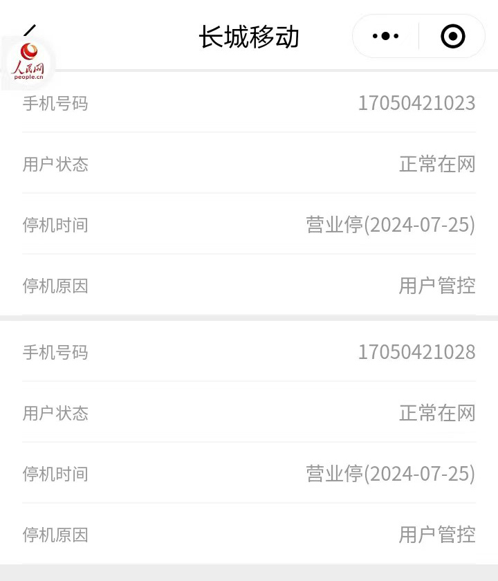 属于长城移动的,是2个“170”打头的手机号,号码归属地显示为辽宁沈阳。致电长城移动“10043”服务热线询问得知,这两个手机号正是上述的“注册卡”,即只能用来收发平台的验证短信注册账号使用。公众号页面显示,两张卡已因为“用户管控”的原因于7月25日被停机。何为“用户管控”?长城移动客服称需要向售卡的代理商询问才能得知,但从两张卡内均有几毛钱余额来看,并非是因为欠费而停机。记者查询网络后得知,运营商“管控停机”可能的原因包括但不限于“手机使用行为异常、身份信息验证问题”等等。