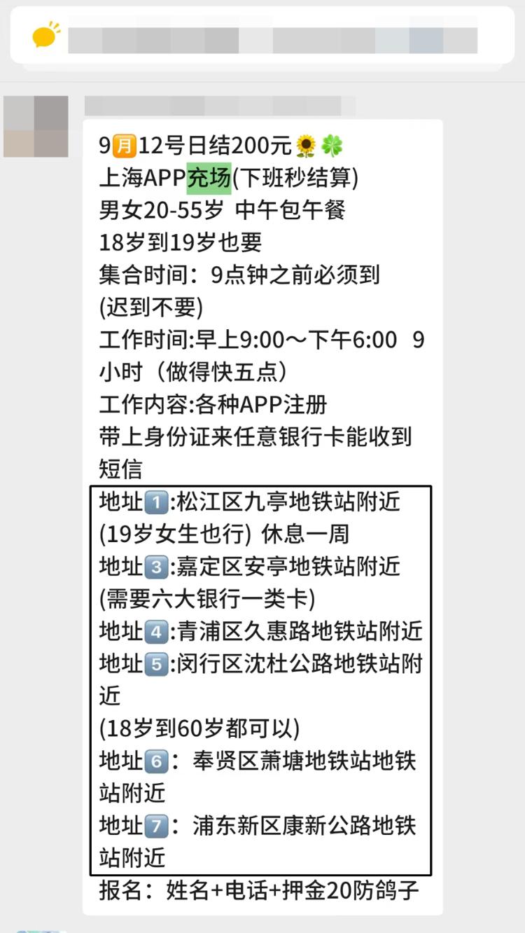 什么是“App充场”?循着李女士的线索,记者也加上了几名劳务中介的微信,他们会通过朋友圈发布各种“打零工”兼职信息,而“App充场”几乎是常驻项目。9月10日一早,劳务中介虞某发布了当天的“App充场”兼职信息,声称只要下载抖音、京东等知名App冲量即可,“工作简单轻松,有空调包午餐”,报酬是200元一天。记者支付押金报名后,被通知9月11日一早8时30分,在8号线沈杜公路站1号口集合。