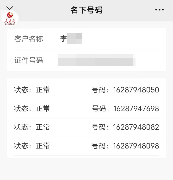 参加兼职者的个人信息显然正是帮助这些卡完成了认证激活。激活的究竟是哪类卡?记者从李女士的28个虚拟号中,随机挑选了长城移动和迪信通通信两家虚拟运营商,请她通过运营商的公众号“名下号码”功能查出了具体的号码。