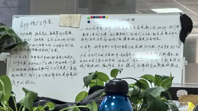 △图为写有“App推广工作室”的白板。